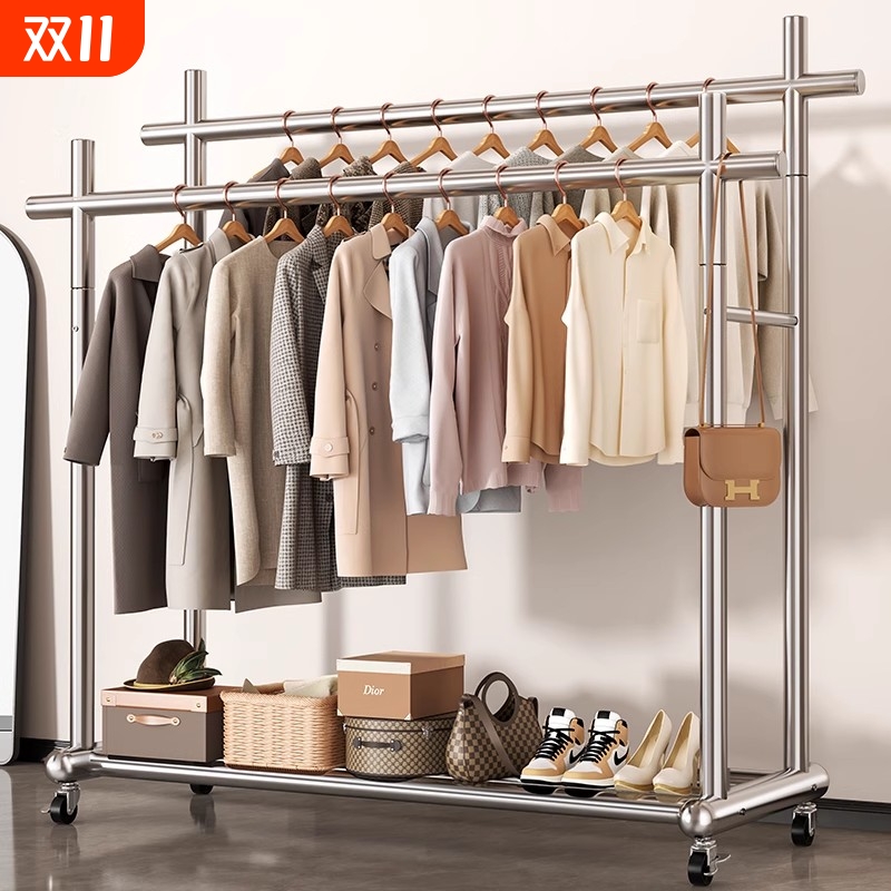 不锈钢晾衣架阳台家用室内衣架卧室落地晒衣服的架子双杆加粗加厚