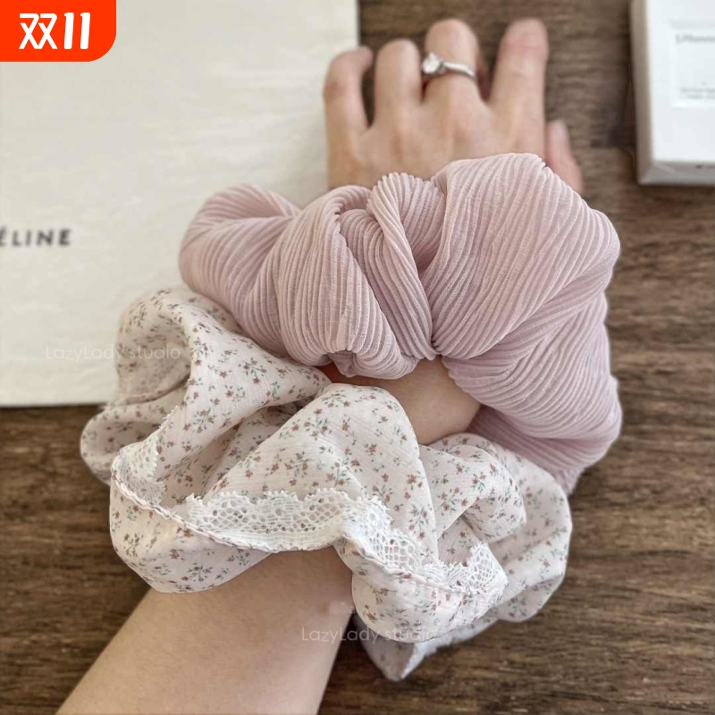 花苞温柔藕粉色肠圈蕾丝耐看大肠发圈碎花清新褶皱风琴头花发圈