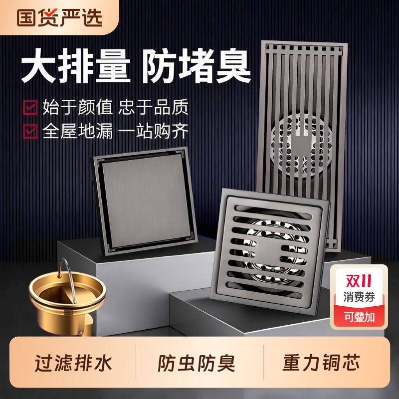 枪灰色加厚不锈钢地漏防臭器卫生间淋浴室洗衣机下水道全铜芯通用