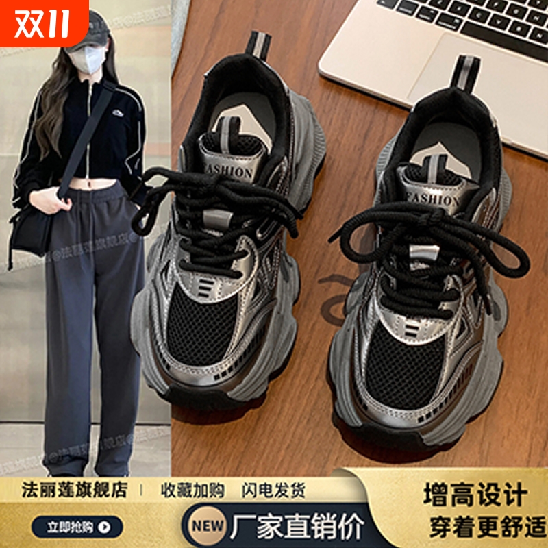 老爹鞋女2025新款爆款夏透气黑色鞋子百搭松糕厚底增高休闲运动鞋