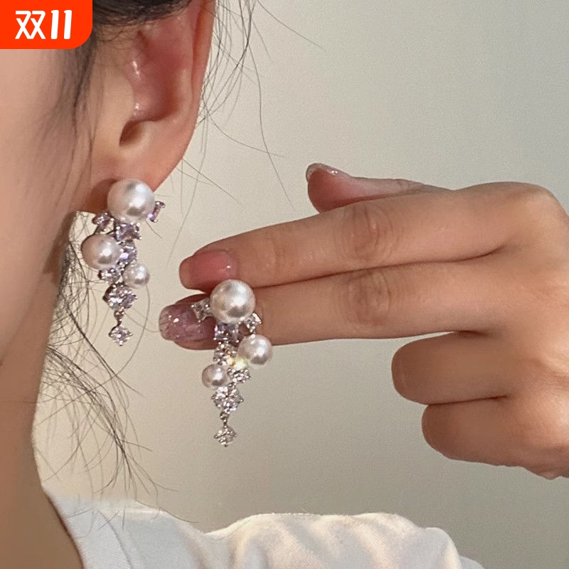 大小珍珠闪钻重工耳环气质耳饰奢华小众设计高级耳钉配饰富家千金