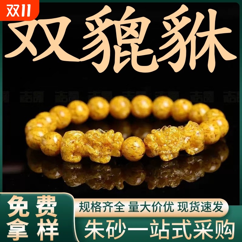 天然原矿朱砂透光晶体砂雄黄双貔貅手串烫金手链女礼物批发单珠