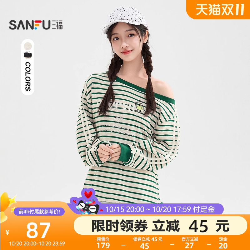 三福斜肩卫衣女2025新款冬季网球条纹英文印花宽松上衣女装510