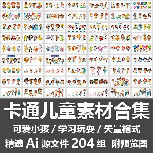 卡通儿童素材合集/扁平可爱小孩子学习玩耍形象装扮插图Ai源文件