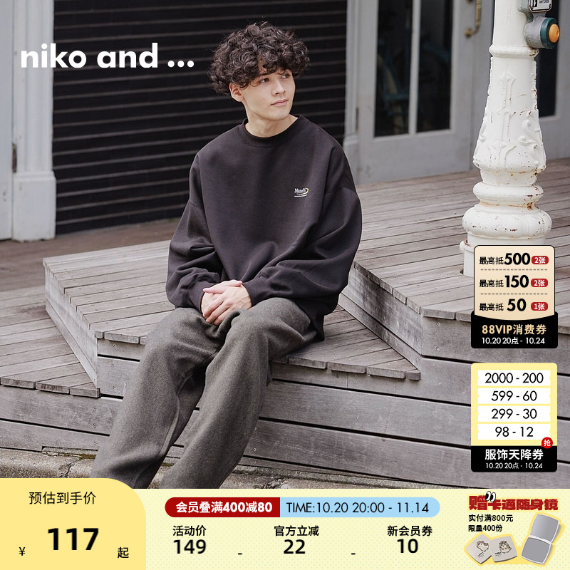 niko and ...卫衣男2025春秋时尚加绒廓形圆领法兰绒
