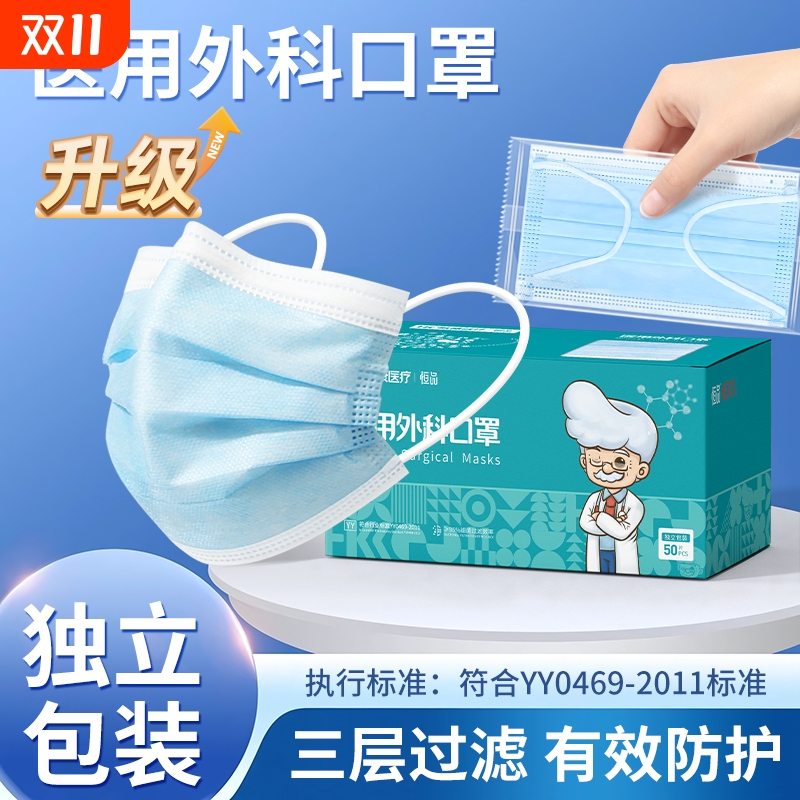 医用外科口罩一次性医疗蓝色白色官方正品防护成人单独立包装不勒