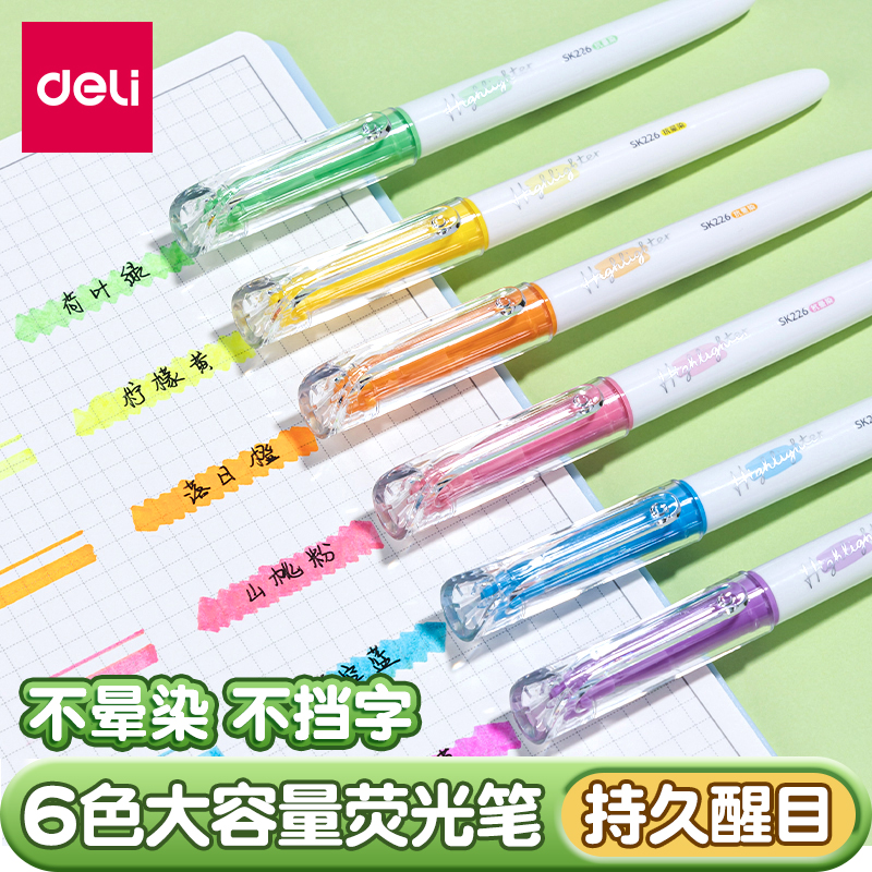 得力抗晕染荧光笔学生划重点做笔记专用大容量高颜值 手账专用