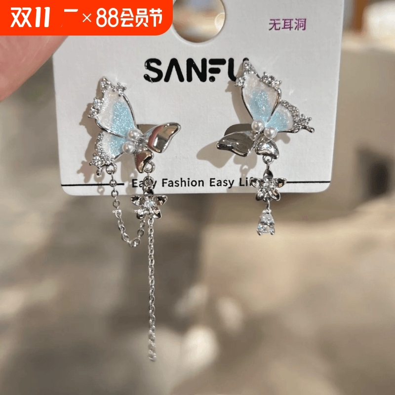 趣味渐变青绿流苏蝴蝶耳夹夏季甜酷辣妹小众高级感耳环女无耳洞