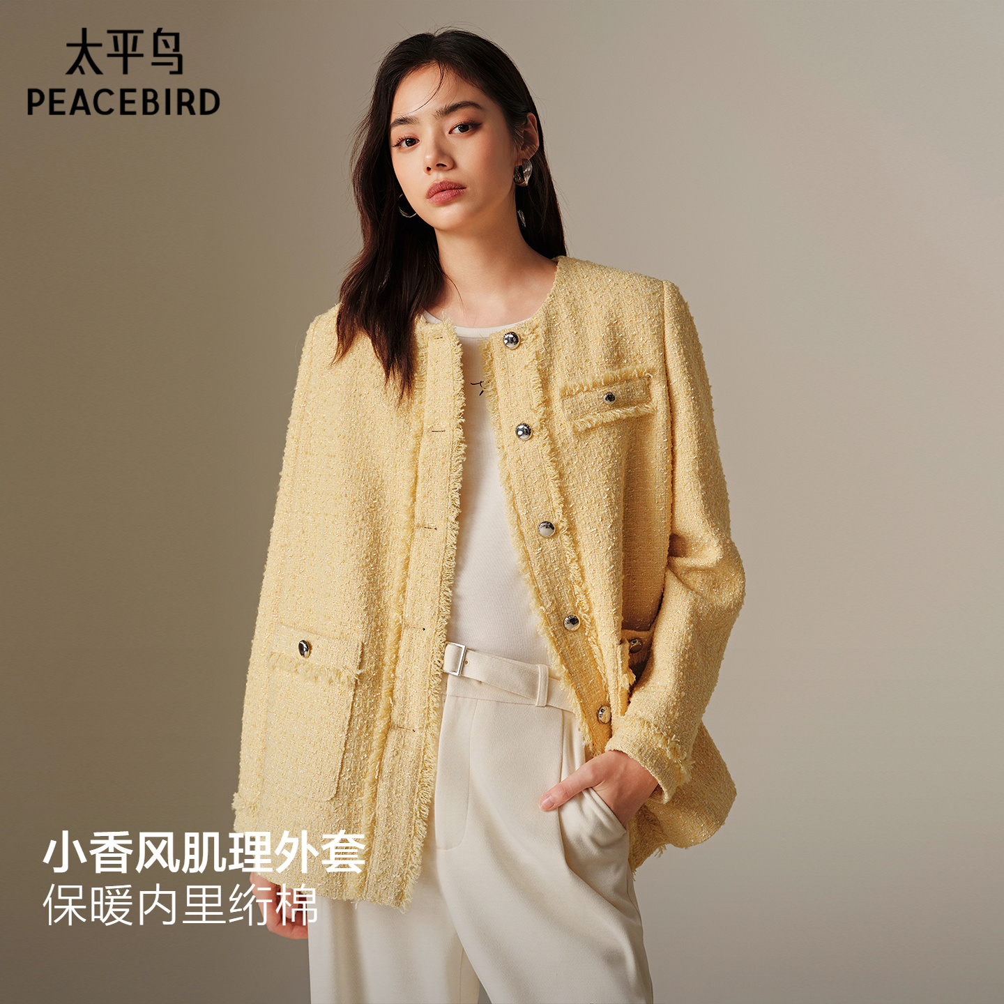 太平鸟绗棉小香风肌理外套箱型显瘦5%羊毛夹棉毛边小香风短外套*