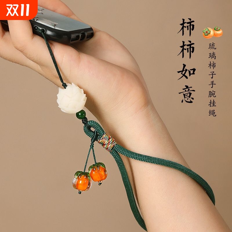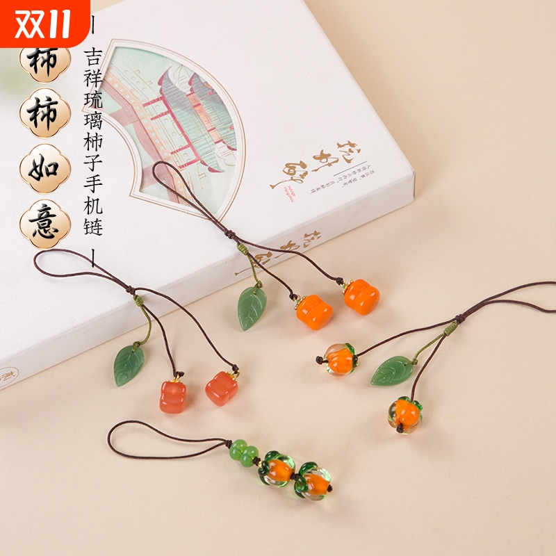 事事如意琉璃柿子手机链挂绳复古中国风柿叶有成钥匙挂件吊坠饰品