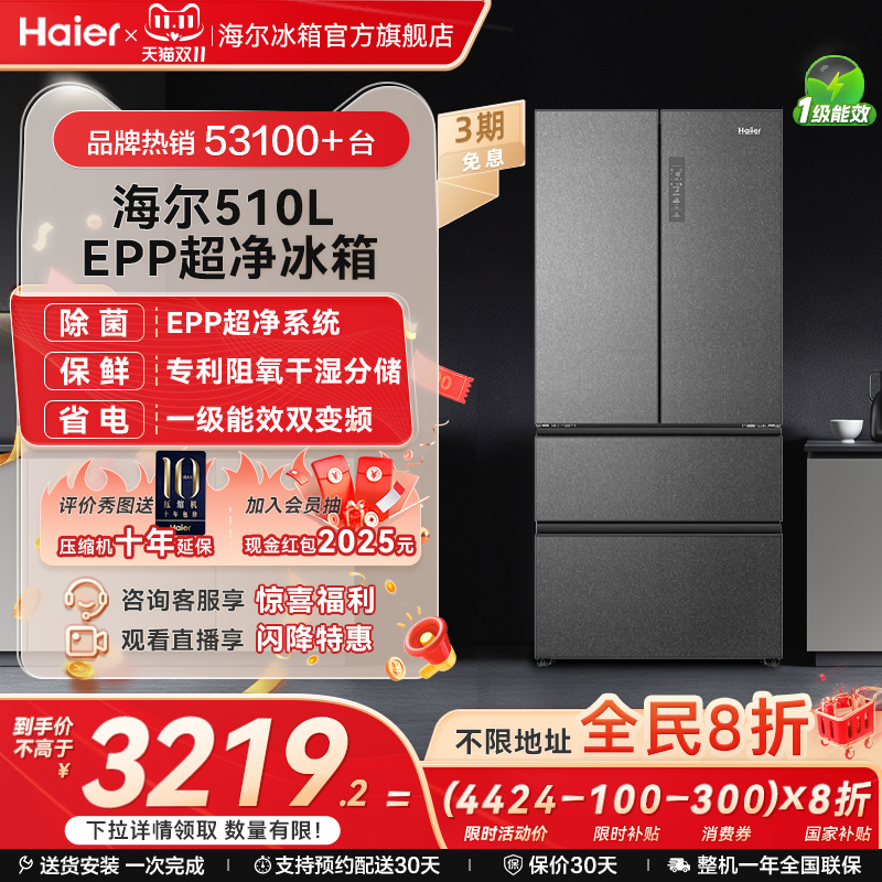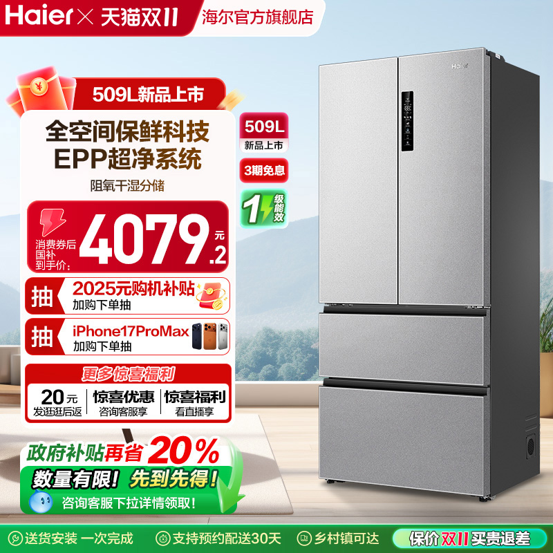 换新补贴海尔分储保鲜冰箱509L法式四门家用风冷母婴三档变温节能