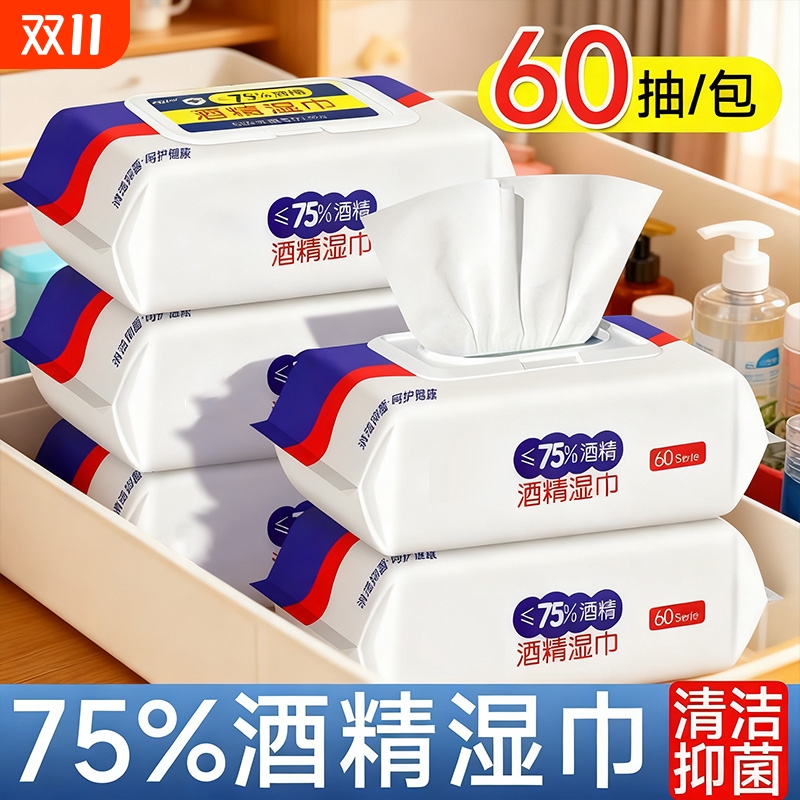 60抽含75度酒精消毒湿巾家用卫生专用清洁杀菌湿纸巾家庭实惠装