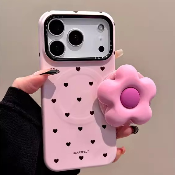 粉色花朵苹果手机壳、爱心波点硅胶花朵磁吸支架适用苹果iphone