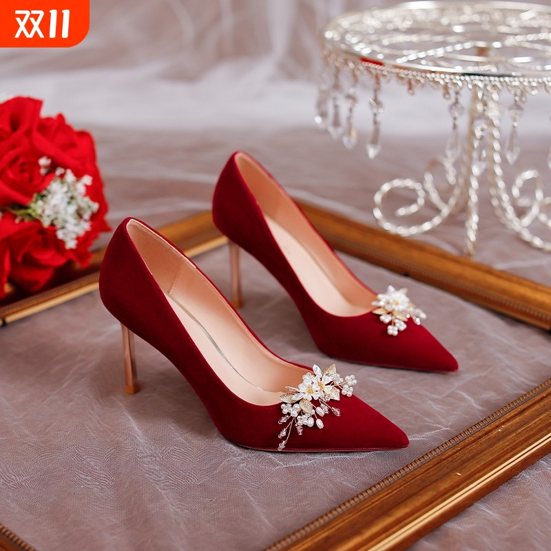 红色不累脚婚礼婚鞋女秀禾婚纱两穿2024年新款细跟高跟新娘鞋法式