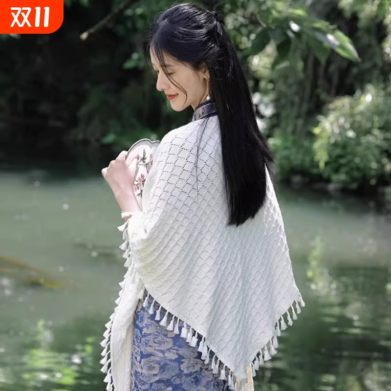 旗袍披肩冬季米白色外搭女针织三角巾披风百搭流苏温柔风保暖开衫