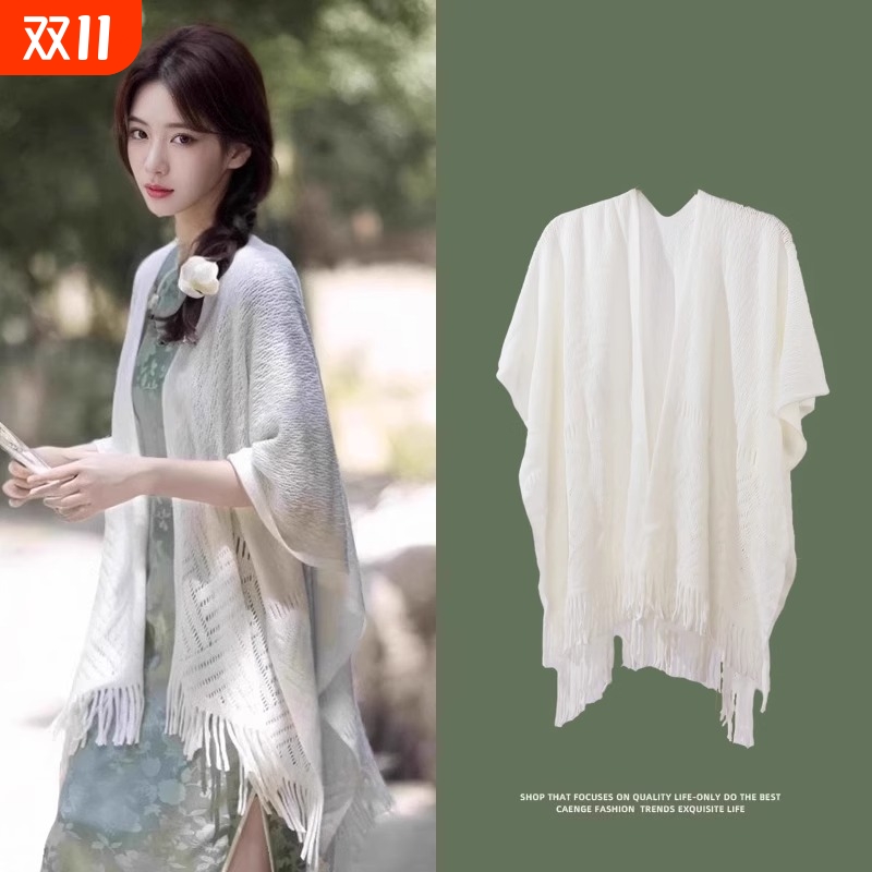 2025镂空中式针织披肩女外搭新款流苏旗袍白色斗篷披风薄款夏纯色