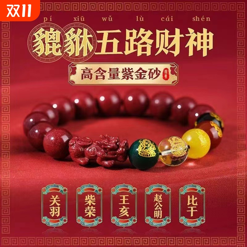 高含量护身符五路财神朱砂手串本命年转运化解紫金砂手链貔貅