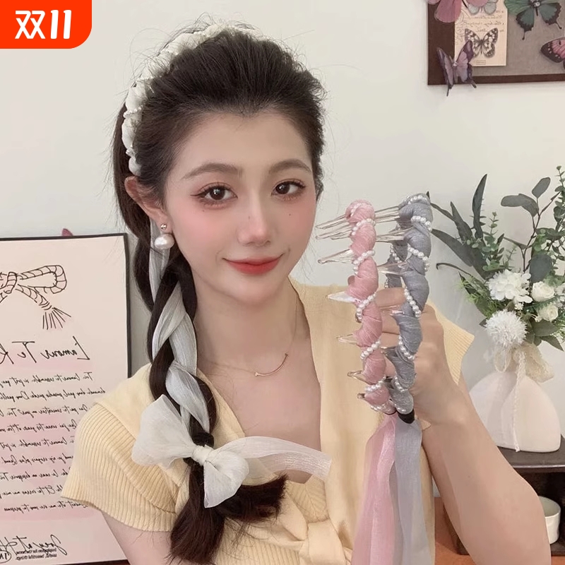 日常珍珠飘带发箍女2025新款高颅顶齿梳发带网纱外戴绑发一体头饰