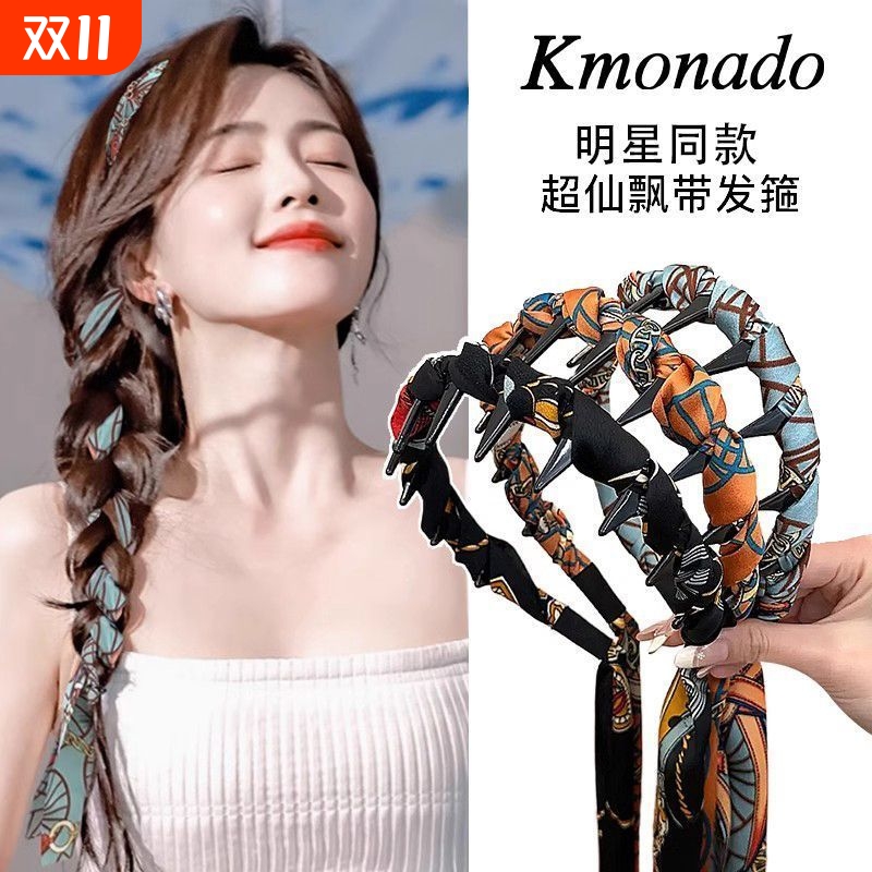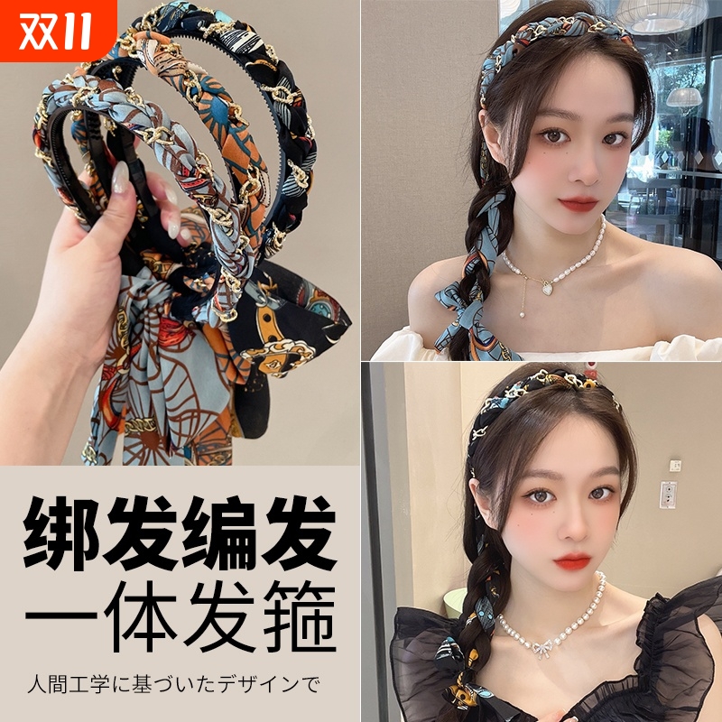 粿复古一体发箍飘带缎面发带丝巾绑发压发高颅顶头箍头饰编发带齿