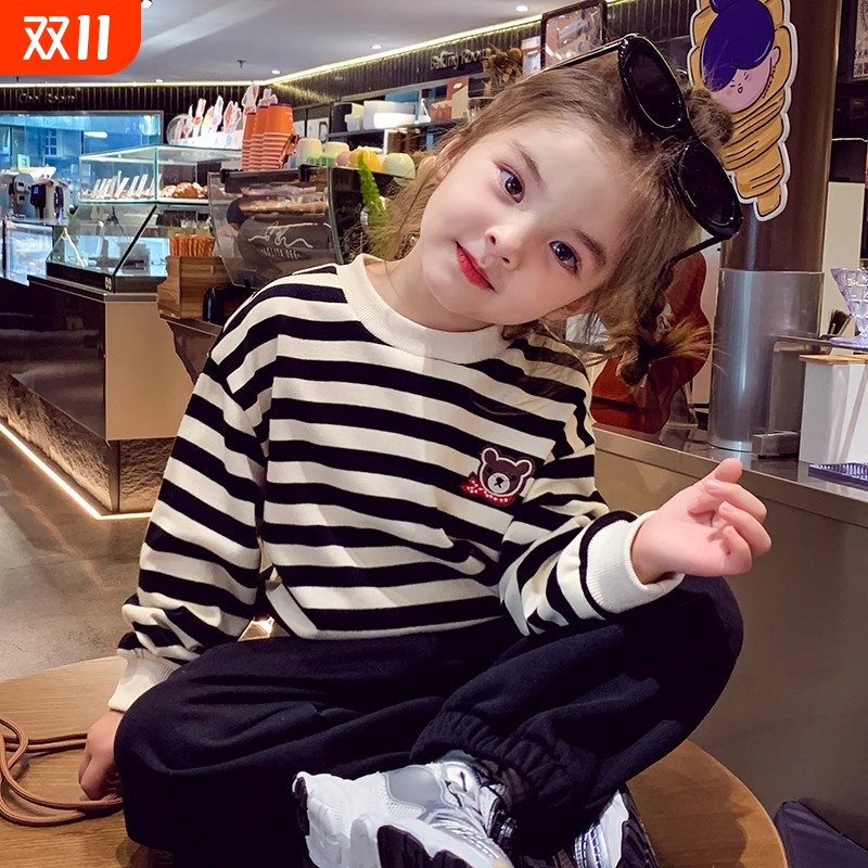 女童圆领卫衣秋装2025新款洋气儿童条纹上衣小女孩打底衫加绒时髦