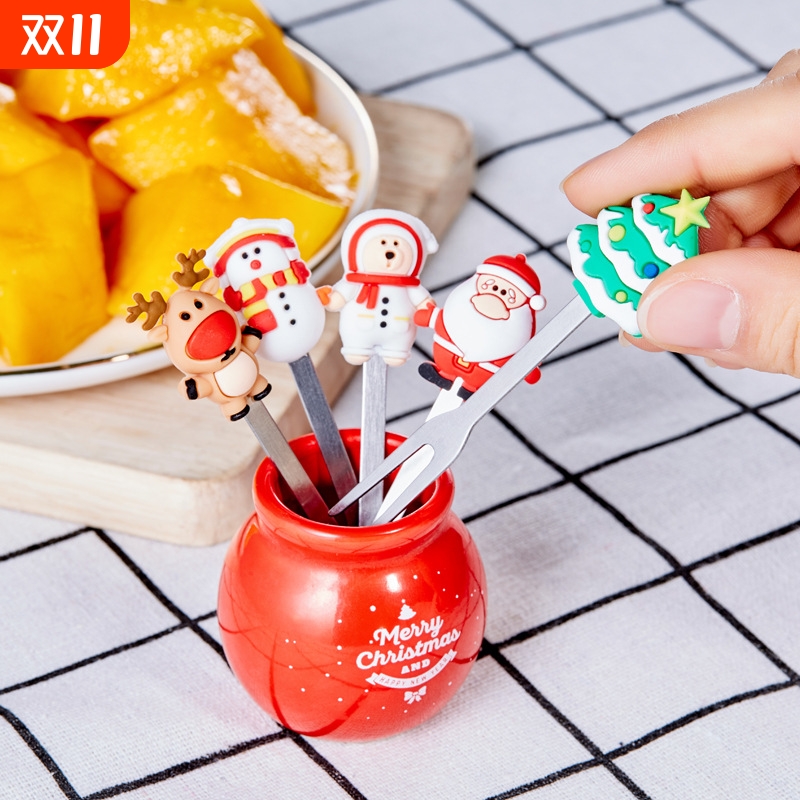 水果叉不锈钢叉跨年圣诞节礼物硅胶水果叉创意带底座水果叉套装