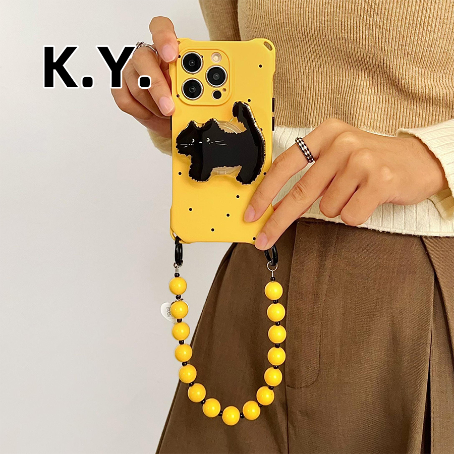波点黑猫支架手机壳带挂绳适用于苹果16promax华为mate6