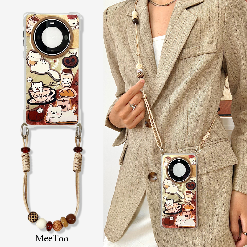咖啡猫咪手机壳带挂绳适用于华为mate60/70iPhone15