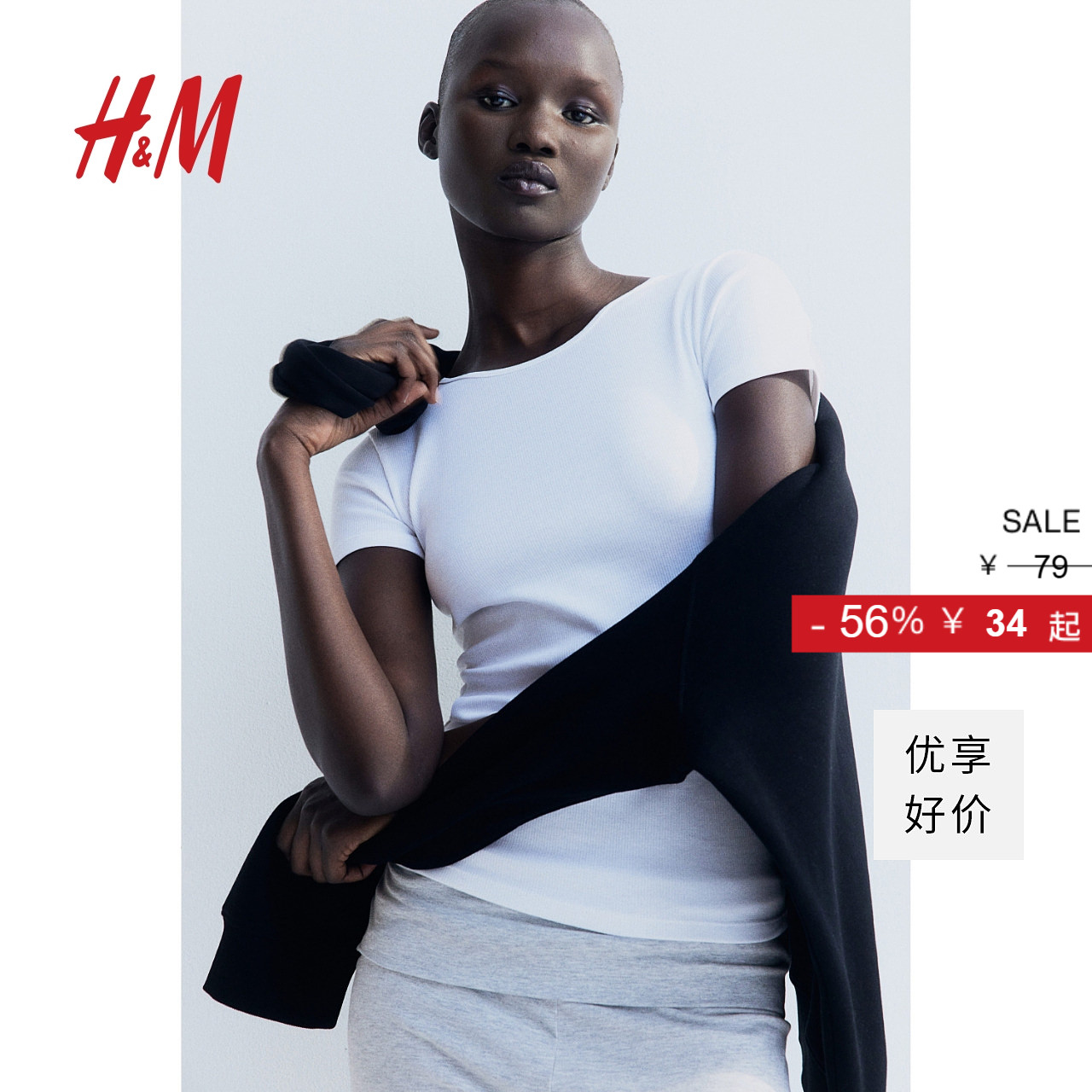 HM女装T恤秋季柔软简约休闲舒适罗纹基础短袖上衣1235366