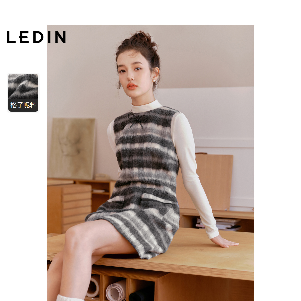 乐町修身背心裙年冬季新款黑白格无袖裙绒感复古千金风连衣裙