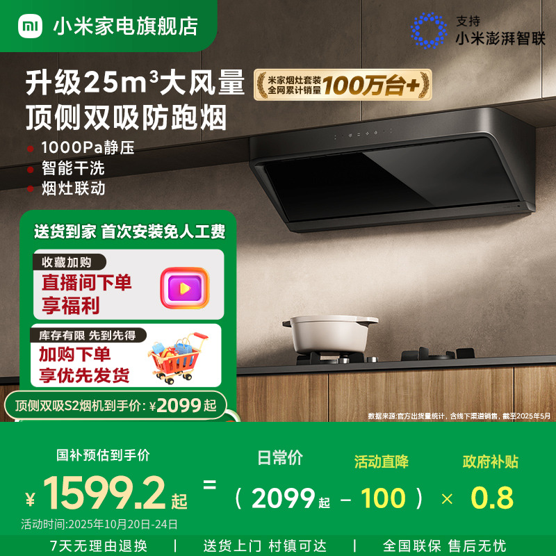【政府补贴】小米米家顶侧双吸S2抽油烟机变频抽油烟机家用自清洁