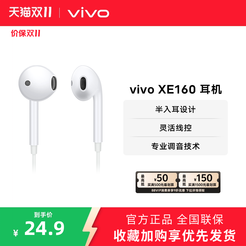 vivo XE160原装耳机专业高音质圆头半入耳式耳机兼容typ