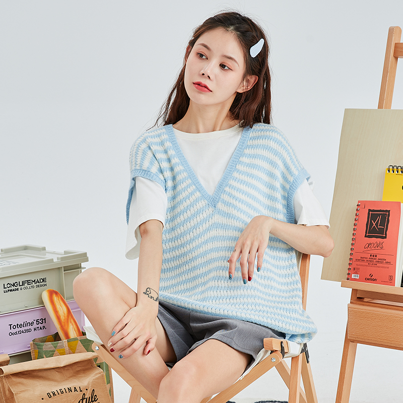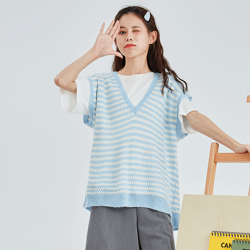 唐狮V领蓝色条纹毛衣马夹女春秋新款少女感背心温柔外搭女针织衫