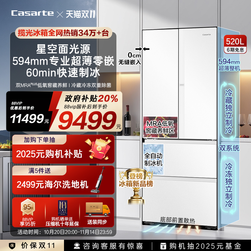 新品卡萨帝揽光520L制冰超薄零嵌入式法式四门一级无霜家用电冰箱