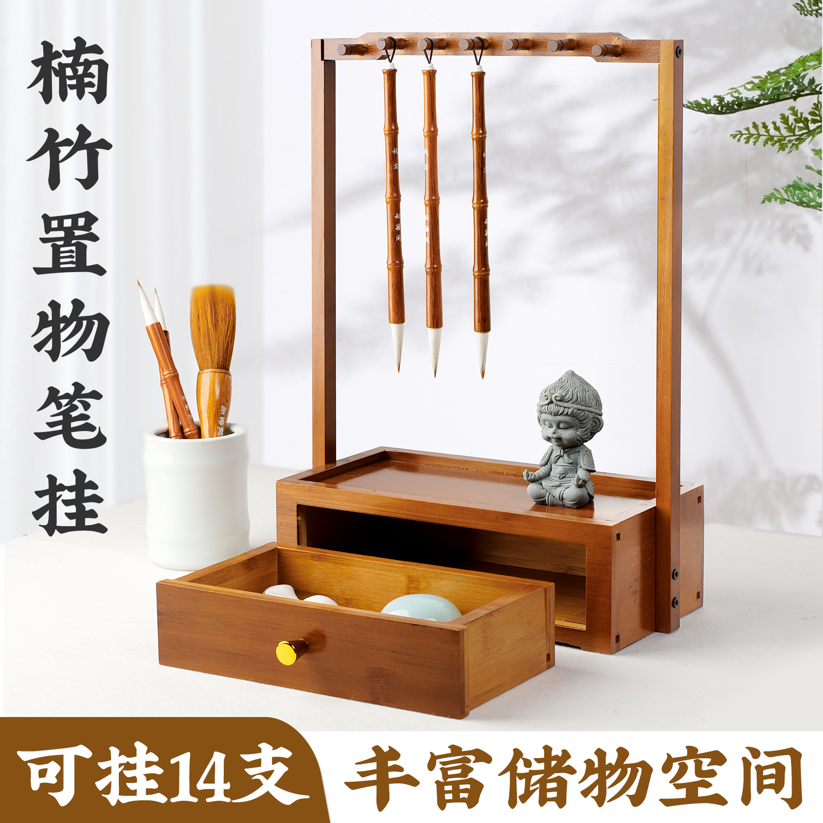 梅林笔庄黄铜毛笔架新中式挂架大容量收纳笔挂实木底座简约摆件创意多