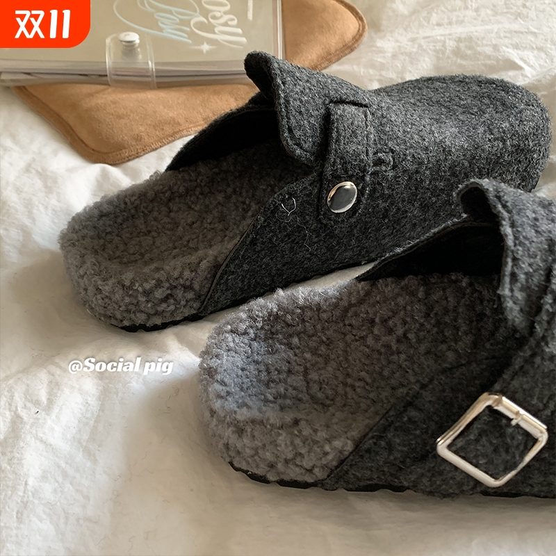 真的好爱灰色~毛毛拖鞋女外穿厚底勃肯棉鞋冬防滑包头半拖鞋