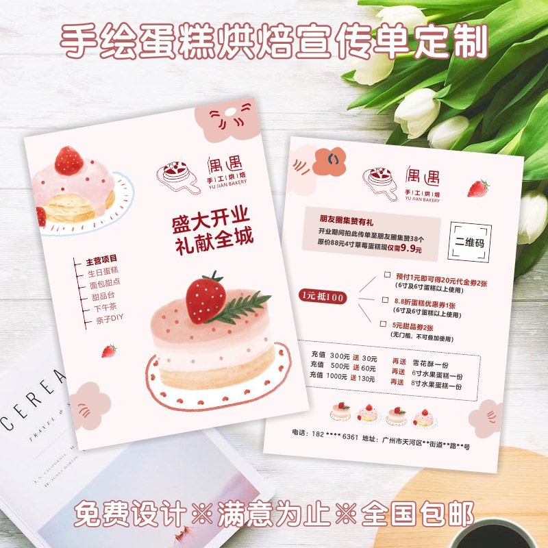 手绘蛋糕烘e焙甜品店开业广告宣传单定制个性化双面铜版纸拓客传