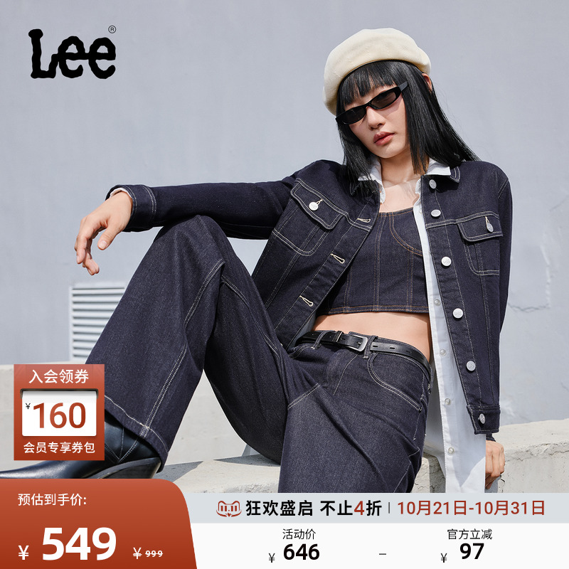 Lee25秋冬新品标准版翻领不易褪色深蓝色磨毛女牛仔夹克外套保暖