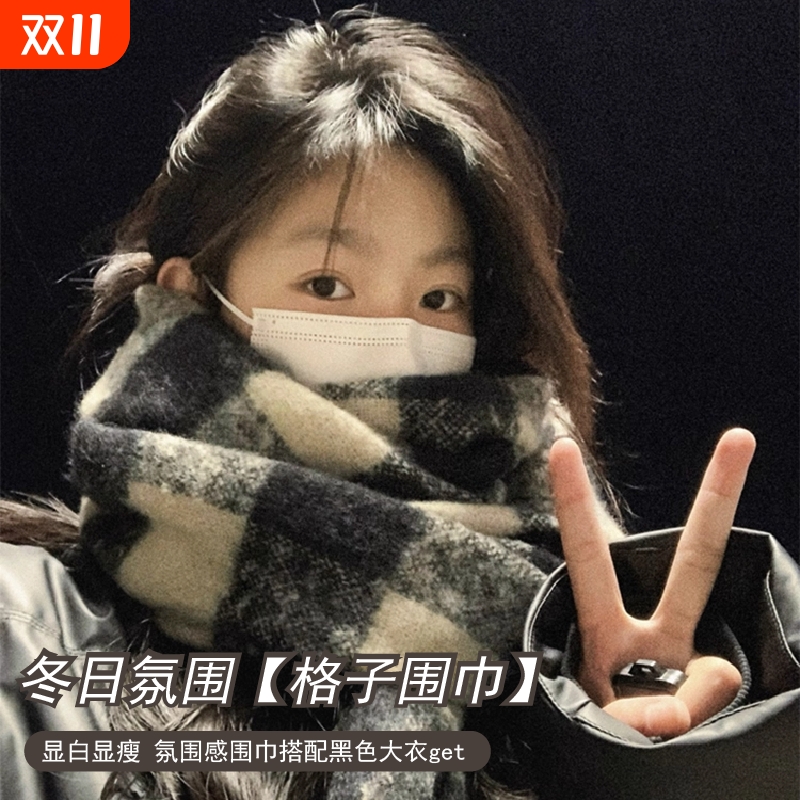 围巾秋冬季女氛围感2025新款黑白格子韩系情侣保暖加厚围脖男绿色