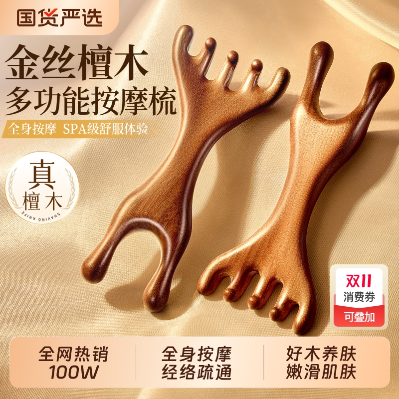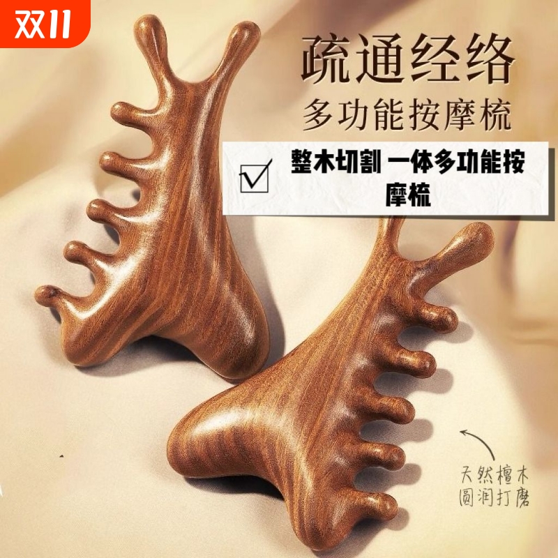 多功能四合一檀木梳头部疗疏通经络神器脸部眼部头皮按摩梳子提拉