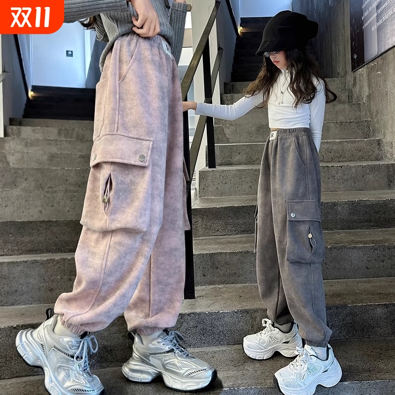 女童裤子春秋冬2025新款加绒中大童束脚长裤儿童宽松灯芯绒休闲裤