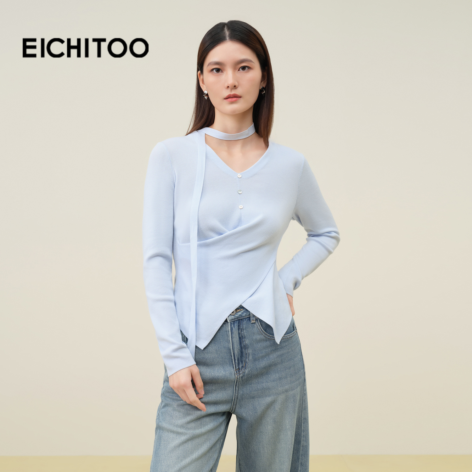 爱居兔设计感修身针织衫女2025年秋季新款baby蓝不规则气质上