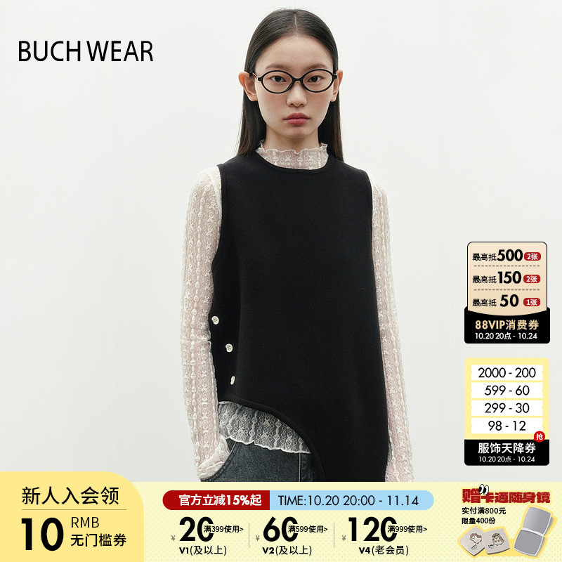BUCH WEAR T恤女2025春季时尚不规则无袖系扣纯色日系