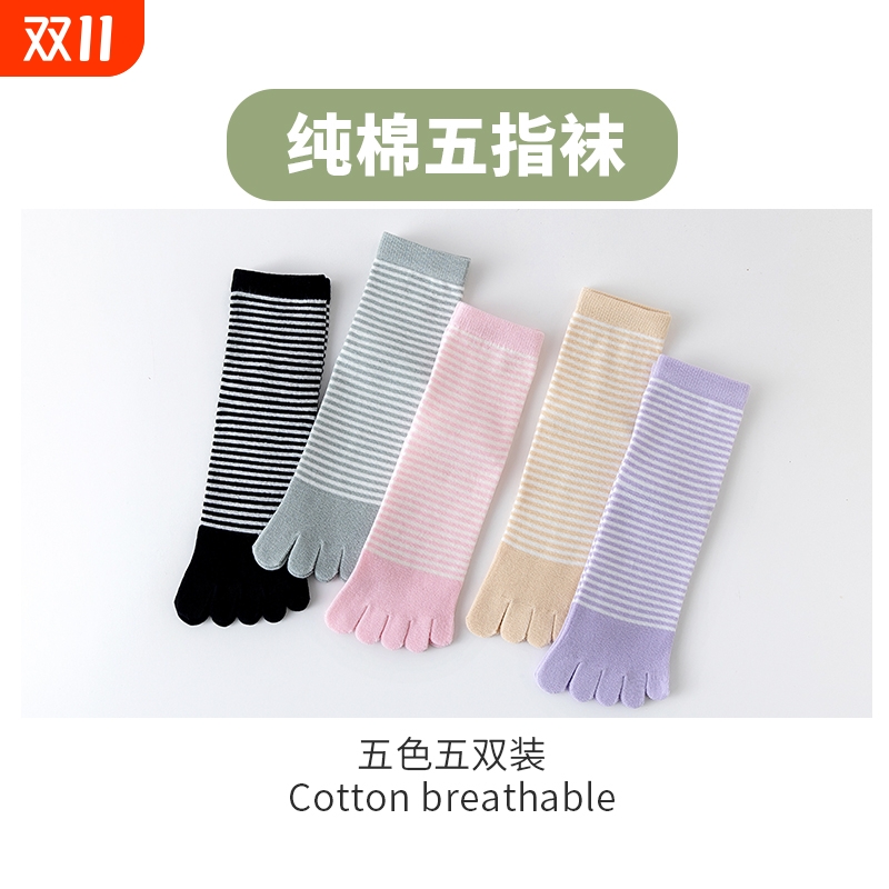亲棉真织五指袜女纯棉中筒袜防臭防脚气分趾袜无骨秋冬季加厚条纹