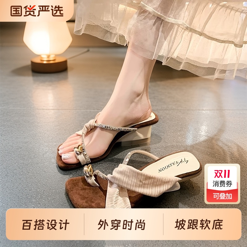 大东时装拖鞋女鞋2025夏季新款优雅方跟低跟套脚露趾亮片X103