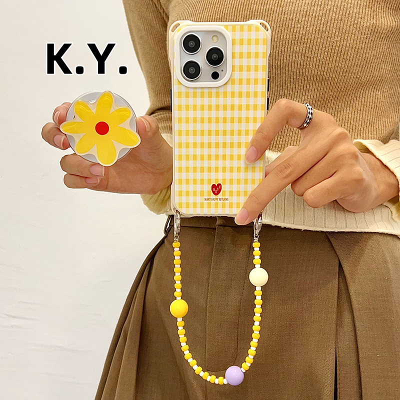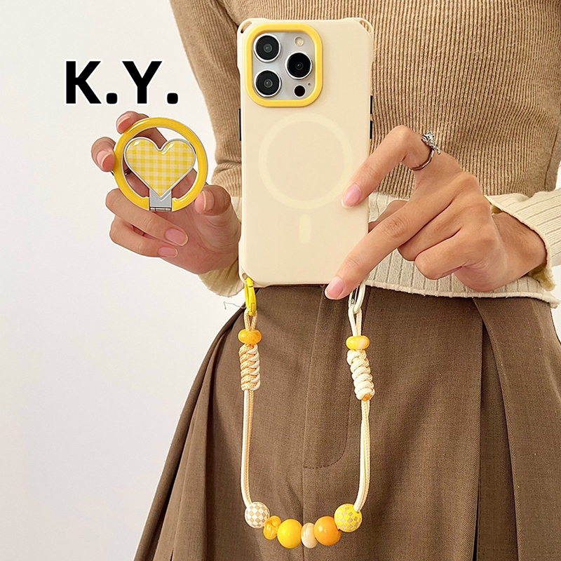 黄格纹心型磁吸支架手机壳带挂绳适用于iPhone16pro华为m