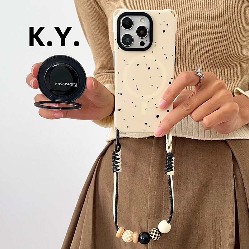 简约波点黑色英文磁吸手机壳带挂绳适用于iPhone16pro华为
