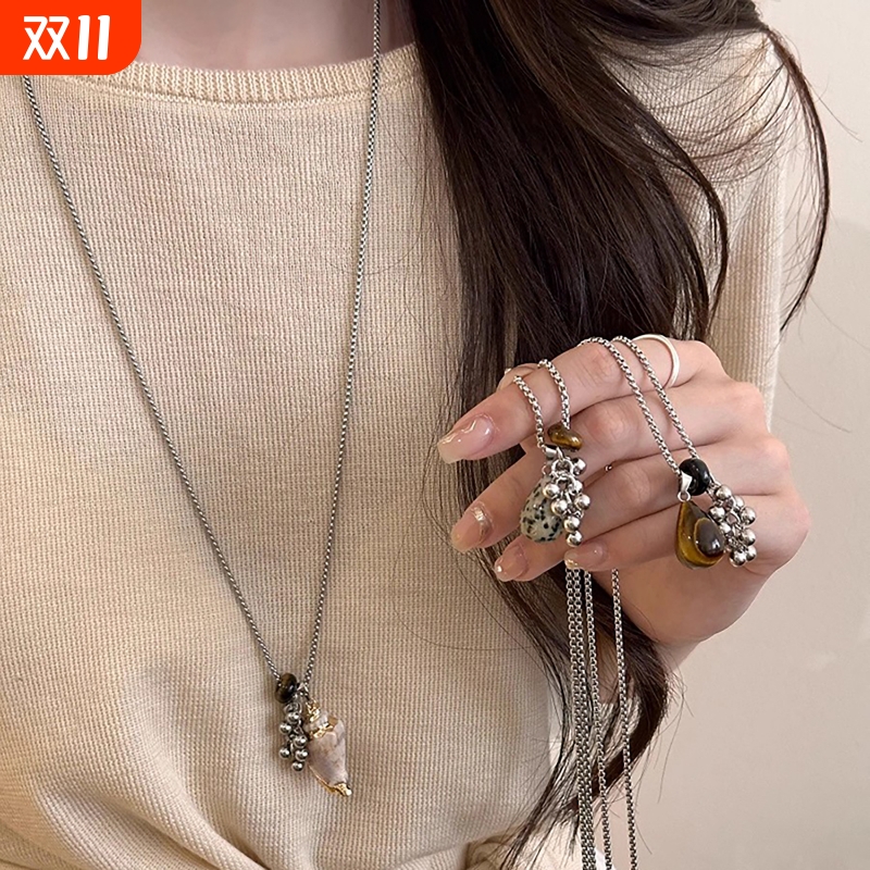 天然石轻奢项链女款2025新款高级感长款毛衣链钛钢小众配饰虎眼石