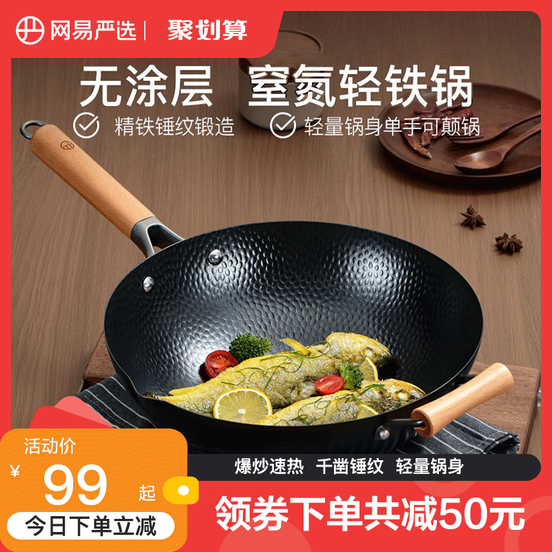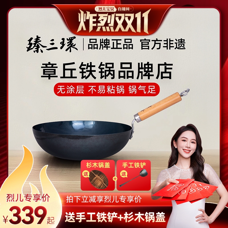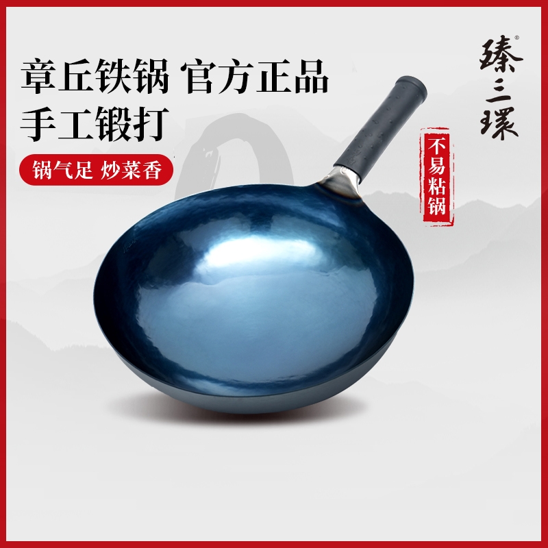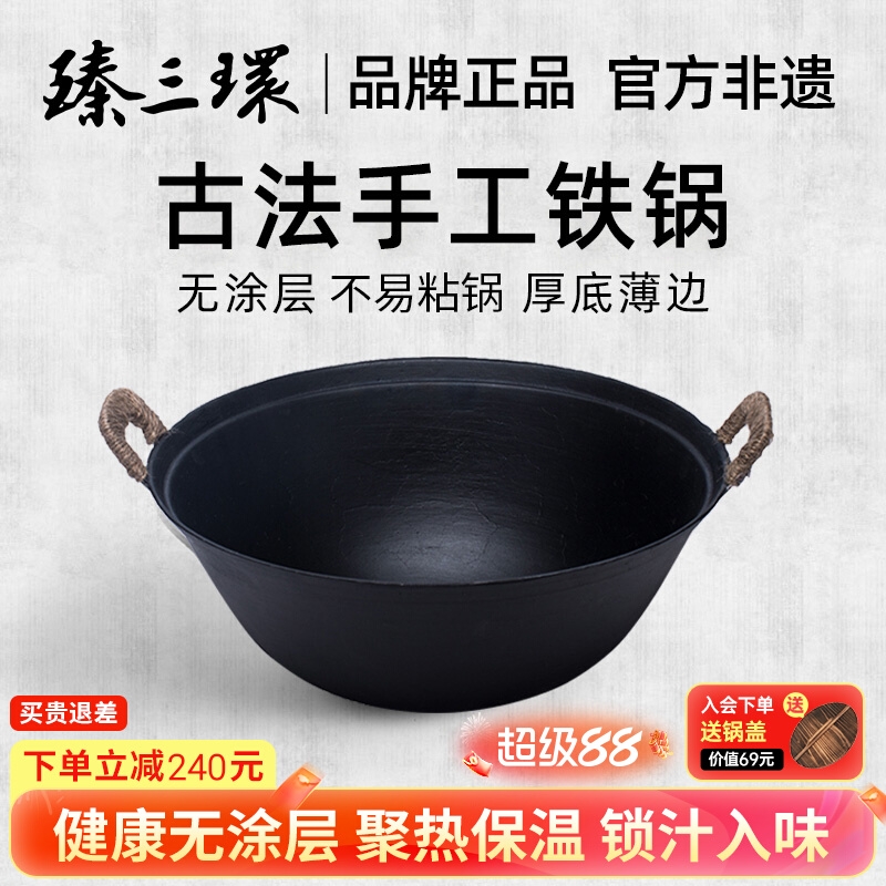 臻三环章丘铁锅手工锻打铁锅无涂层不易粘锅老式家用炒锅铁锅
