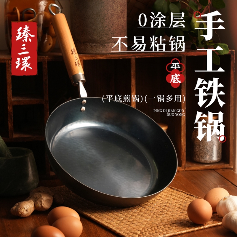 臻三环章丘手工铁锅平底锅无涂层不易粘锅平底煎锅小铁锅辅食锅