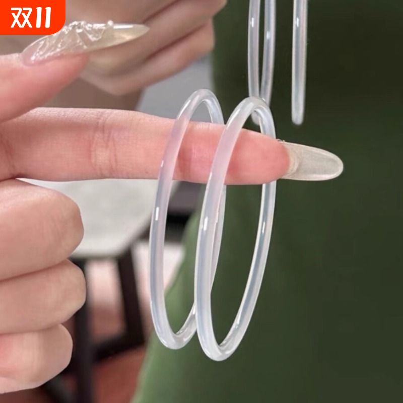 叮当镯一对冰种天然荔枝冻玉髓玛瑙细圆条高冰白月光玉镯翡翠两条